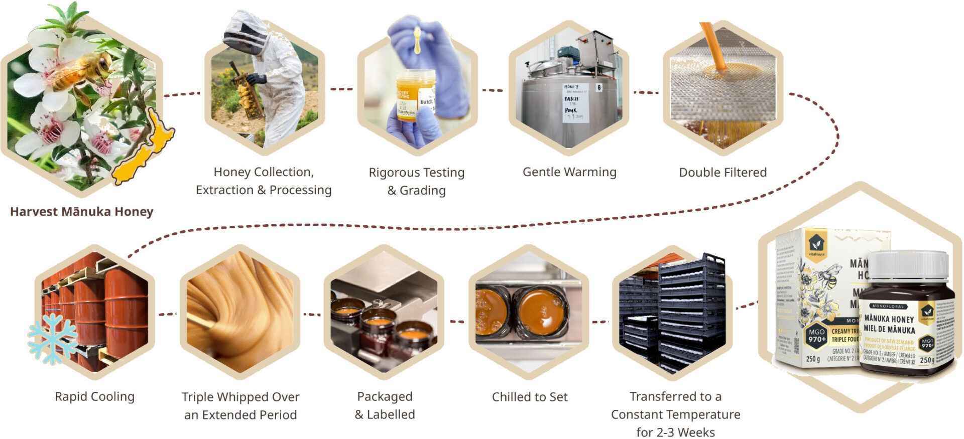 Vitahouse™ Mānuka Honey MGO 970+ is sourced from beehives located in the remote, mountainous regions of New Zealand, where Mānuka trees grow naturally. It is carefully harvested and processed in high-standard facilities designed specifically for Mānuka honey production. Our honey meets strict New Zealand quality and purity standards and is produced in compliance with food safety regulations.