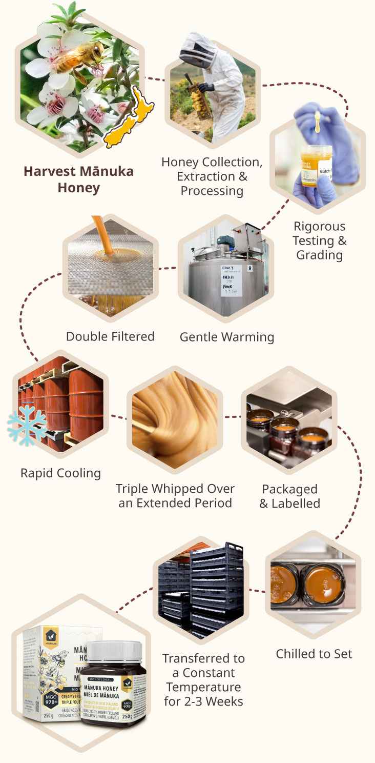 Triple Whipping is our unique processing technique designed to give the honey a smoother, creamier texture. After filtration and cooling, the honey is transferred to a specialized device where it is continuously churned for over 72 hours to achieve the Creamy Triple Whipped effect.